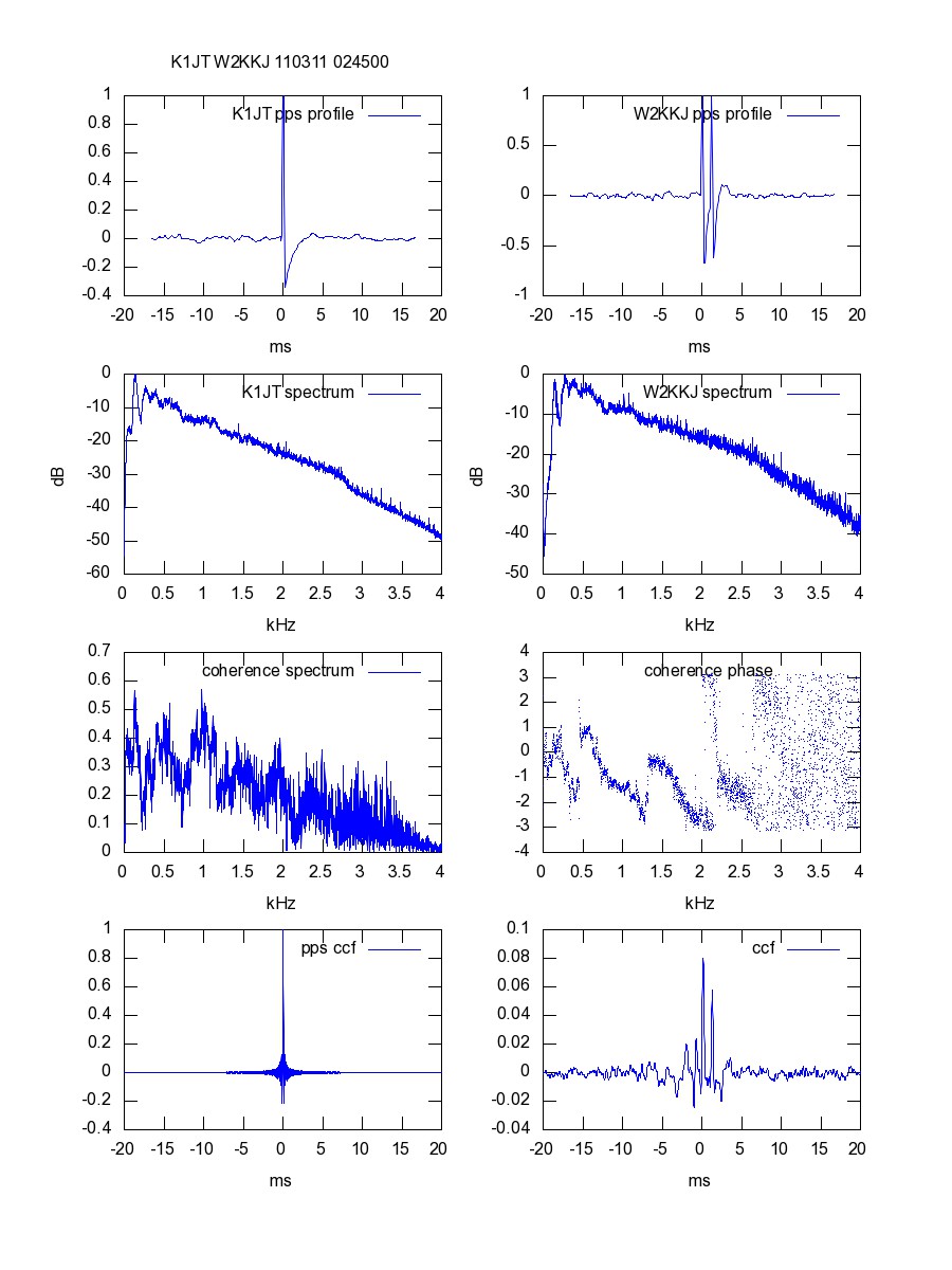 A typical cross-correlation analysis page displays key information obtained by comparing two 1 pps time-tagged audio streams recorded at two receiving locations. Example: