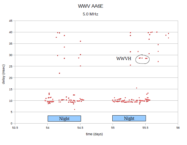 This plot shows all the delay solutions obtained over the run. (Note that the scattered points are invalid noise solutions. Good solutions fall in narrow delay ranges.) Usable signals are received only in the evenings, and WWVH makes an appearance toward morning of the second day.